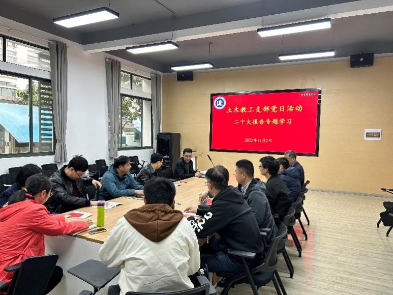 2022年11月16日,成人直播 土木教工支部在明行楼119会议室学习了“的二十大报告重要内容。学习会由支部书记耿犟主持,支部全体党员参加会议。
