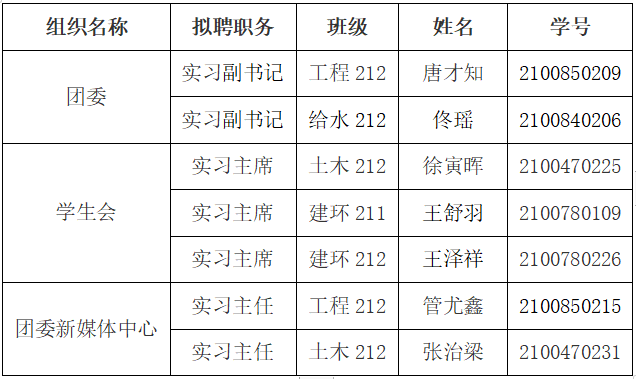 经学生本人申请,并通过竞选、答辩及民主投票等环节综合测评,院团委审核,现将2023-2024学年成人直播 学生组织主席团成员拟聘人选公示如下(考察期三个月),实习期满考察合格后转正: