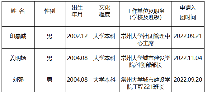 经征求团员群众意见、团支部集体研究,拟将印嘉诚等3名同学确定为新发展对象,现予以公示。公示时间:2023年10月8日至2023年10月12日(5个工作日)。如公示对象存在问题,欢迎广大团员群众通过来电、来信、来访反映。以个人名义信函反映问题提倡署真实姓名。联系人:程成,联系电话:0519-86330218。