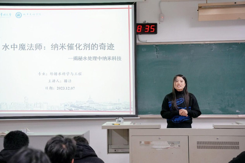 讲座开始,滕洁老师围绕“水中魔法师,纳米催化剂的奇迹”这一主题引出给排水专业的历史背景,讲述了本专业在城市规划中的意义与作用,重点介绍了污水处理流程。滕洁老师还将催化剂比做“魔术师”,以通俗易懂的语言让学生认识到给排水专业的社会意义。随后,滕洁老师为学生们详细解说了给排水科学与工程专业的专业特色、人才培养、发展前景、职业规划等内容。最后,滕洁老师给予同学们暖心寄语并提出殷切期望,在同学们热烈的掌声中本次讲座圆满结束。