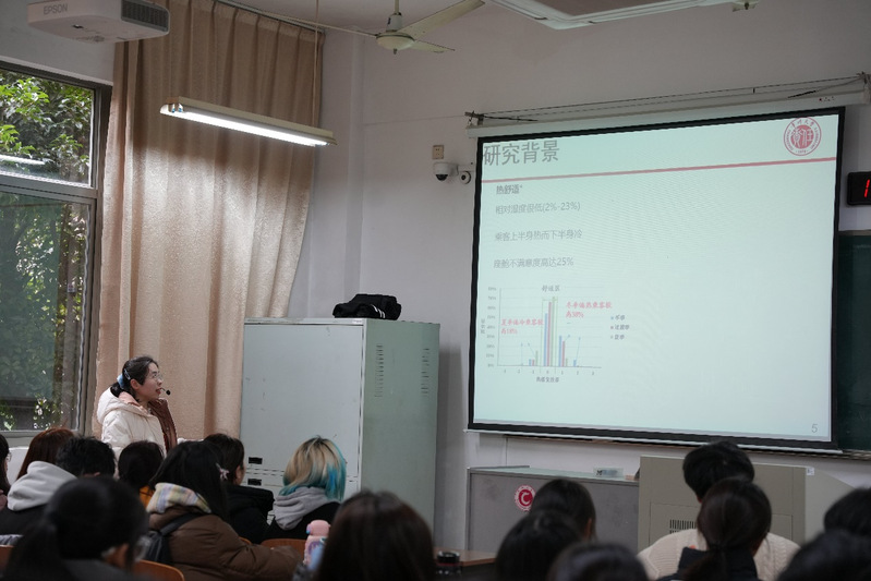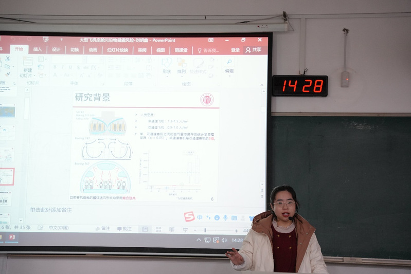 讲座开始,刘老师向同学们介绍主题“大型客机机幸病原微生物实测气流传播规律研究”。从研究背景切入,就飞机中病原微生物的传播提出客机舒适与健康问题引发同学们的思考。通过展示PPT,图文并茂地讲解了为什么在上机调研中选用单通道客机进行实验操作,并在CFD模拟仿真预测中以混合通风和置换通风的对比得出实验结论。讲座最后,刘老师与同学热情互动,细心解答同学们在讲座和学习生活中的疑问,同学们受益匪浅。