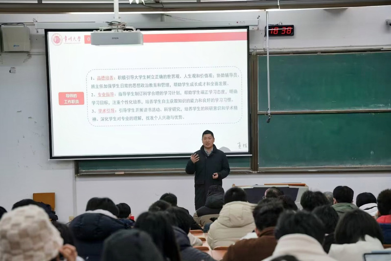 刘少峰老师围绕导师工作职责、注意事项等对工程管理系本科生学业导师实施方案进行详细介绍。学业导师依次上台介绍学习经历和研究方向,对同学们提出殷切期望。李小双表示,学业导师制会形成一种新型的导学模式,在同一位导师的带领下,本科生和研究生之间会有更多的交流,从而形成“学学相长”的良好局面。王伯林对专业进行全面介绍,希望同学们加深对专业的认知。蒋宏伟对同学们提出多学习、多思考、多实践的“三多”要求。邵丹迪希望同学们积极参与,珍惜资源,在学业导师的指导下,做好生涯规划。同学们表示,学业导师制可以帮助我们更快适应大学生活,专业导师的个性化指导可以让我们在今后的学业、就业以及创新创业等方面有更好发展。