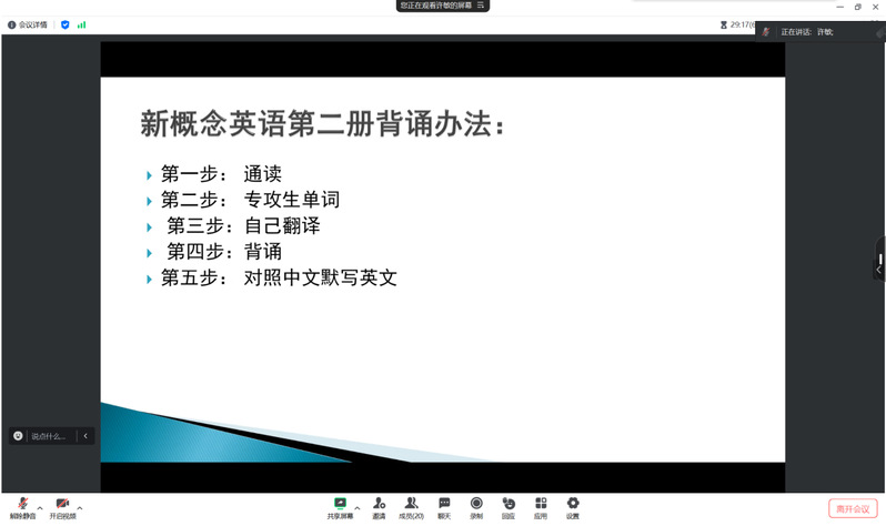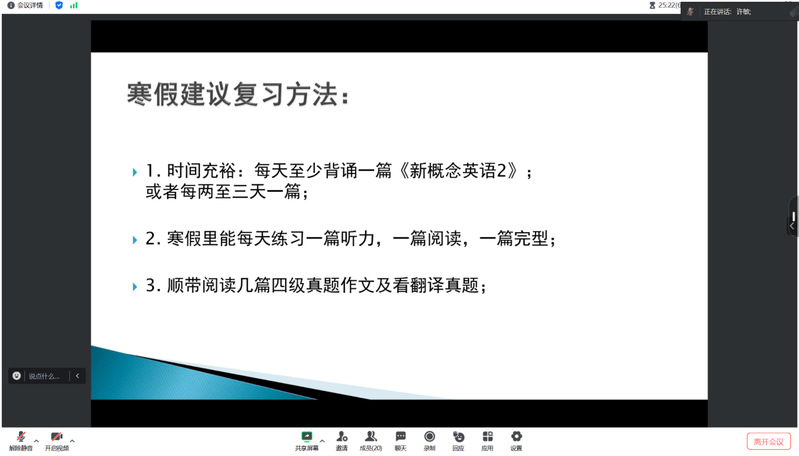 许敏指出,大学生英语四级证书是当下就业和考研的基础证书,建议利用充裕的寒假时间,制定个性化的学习计划。随后,许敏老师分享了每日背诵、阅读技巧、单词积累等方法,让同学们通过大量的阅读和背诵,增强语感,达到举一反三的水平。同时介绍了成人直播 春学期四级帮扶计划,更有针对性地提高同学们的复习效率。