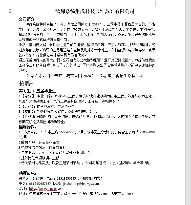 招聘[2024077]鸿辉系统集成科技(江苏)有限公司2024春季校园招聘