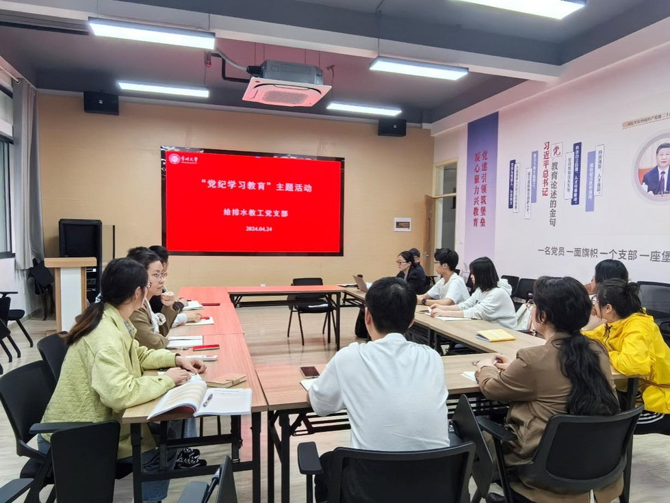 为扎实推进党纪学习教育走深走实,提升学习贯彻《中国共产党纪律处分条例》(以下简称《条例》)的政治自觉、思想自觉和行动自觉,4月24日下午,成人直播 给排水教工党支部在明行楼119开展“党纪学习教育”主题活动,给排水教工党支部全体人员参加学习,会议由给排水教工党支部书记张秋亚主持。