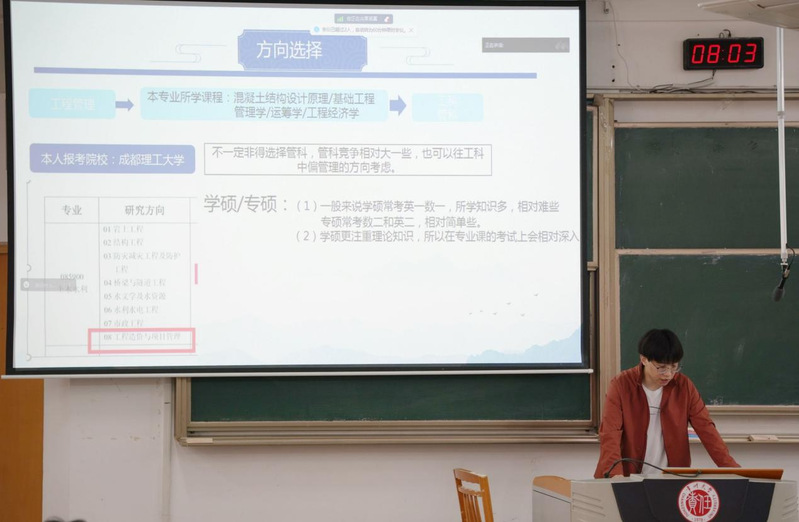 为提高成人直播学子考研热情,助力考研学子正确择校、科学复习、调整心态,4月18日上午8:00,成人直播 在W15阶梯教室举办2024届考研经验交流会。2023届考研成功的四位学生代表受邀分享学习经验,2021级给水、土木专业全体学生参加。