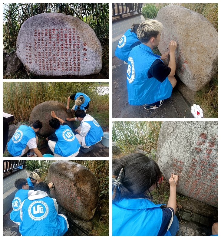 5月28日下午,23级土木学子提前准备了清洗剂、抹布、水桶、丙烯颜料、毛笔等材料,相约若愚亭旁,用半天时间共同打扫周边的卫生,擦抹灰尘,并小心翼翼地为若愚石重新上色描红。77级校友是成人直播 首届学生。求学四年中三易校址,困难重重,然而师生同心,攻坚克难,终成学业,毕业后为江苏石油化工事业的发展贡献力量。重新上色越描越浓的若愚石在同学们笔下焕发了新的色泽与生机,也承载着校友们铭记校训的感恩情怀。