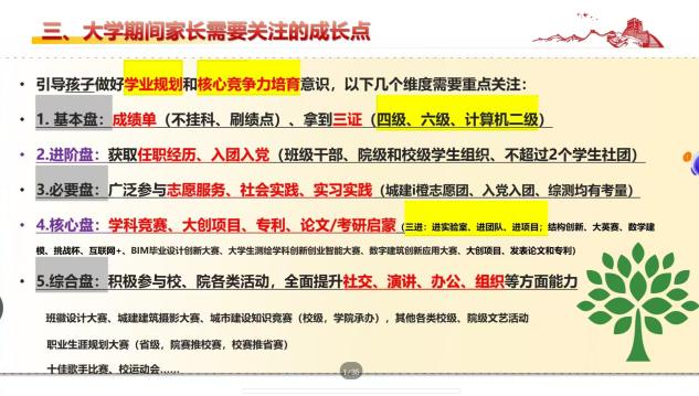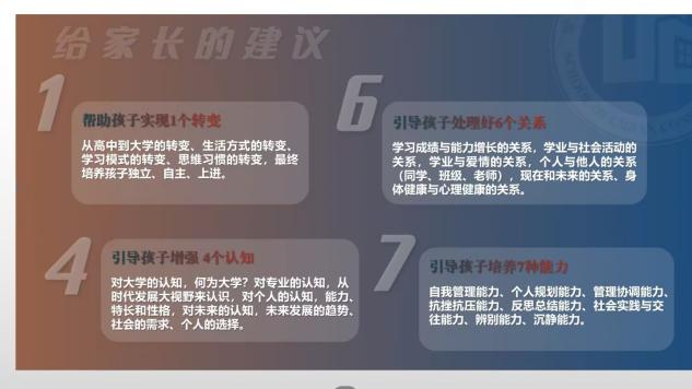 会议伊始,顾坚详细介绍成人直播 基础状况、综合实力、办学结构、教育基础、办学特色、创新创业特色、学科建设等方面情况,综合概括学校成人直播 优势。在学生培养上,他提出了“1个转变,4个认识,6个关系以及7种能力”的建议,并强调家校联合,共同给学生提供一个良好的发展空间。接着,程成分析了大学中常见的共性问题,并点明学生由他律转向自律产生的8个问题。最后明确了大学四年“一单三证”的毕业要求和考研规划。