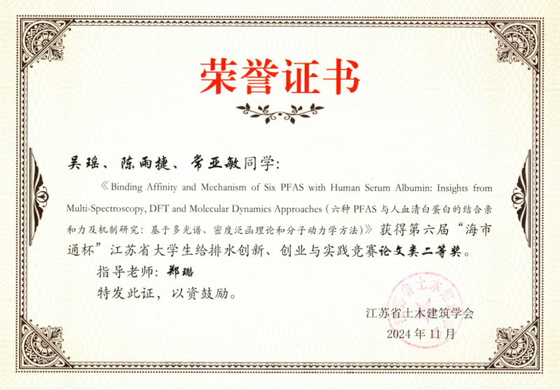 在本次竞赛中,给排水专业有4个项目获奖,其中2项作品获二等奖、2项作品获三等奖。马瑞、李佳瑶、刘建亮、靳墀、王生存同学参赛的作品《水质安全守护者:一种消毒副产物的在线监测与综合安全评价智能平台》,吴瑶、陈雨捷、常亚敏同学参赛的作品《Binding Affinity and Mechanism of Six PFAS with Human Serum Albumin:Insights from Multi-Spectroscopy,DFT and Molecular Dynamics Approaches》分获创意类、论文类二等奖。