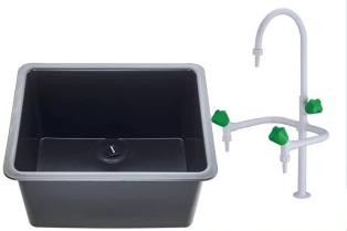 作为实验室重要的配件与水龙头搭配,用于实验室器具的盥洗。水槽边沿平整,契合台面。水槽需自带溢水功能,可防止在实验过程中无人看管时水漫过台面的情况。水槽材质为防腐蚀材质。主要搭配 PP 存水器,防止虹吸现象。