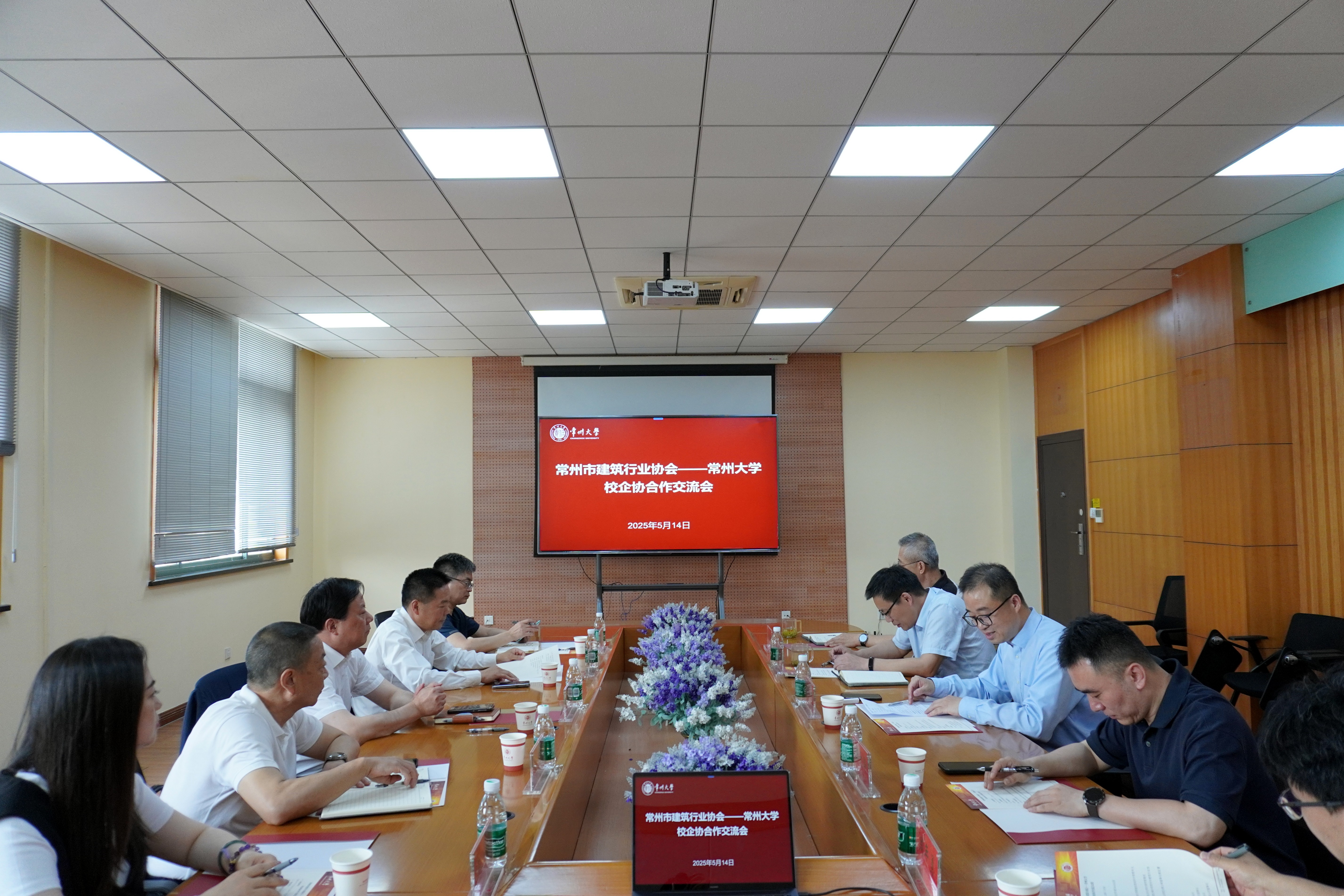 5月14日下午,常州市建筑行业协会会长、常嘉建设集团有限公司董事长殷云峰一行来校开展校企协合作交流。金坛区建筑行业协会会长、江苏城东建设工程有限公司董事长周月怀,武进区建筑业协会会长、中绿建欣达建设集团有限公司董事长赵骏,常州市建筑行业协会秘书长朱俊毅,常州市建筑行业协会副秘书长李婷陪同交流。我校党委常委、副校长周刚出席交流活动,校后勤管理处处长、基建处处长王文涛,成人直播 党委书记刘茂灿、院长乔元明、院长助理周年勇参加交流。会议由刘茂灿主持。
