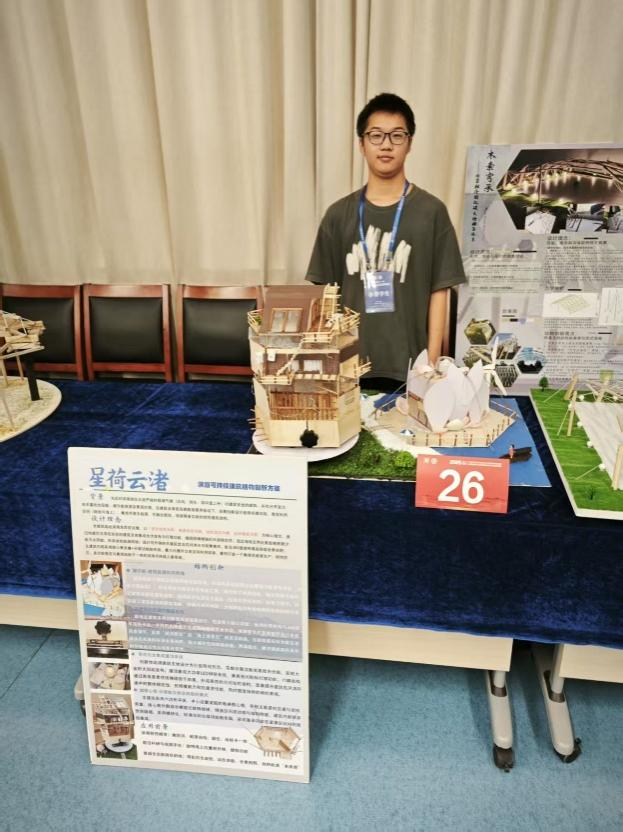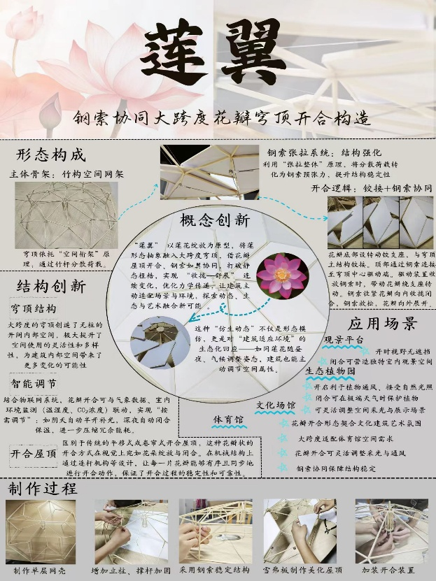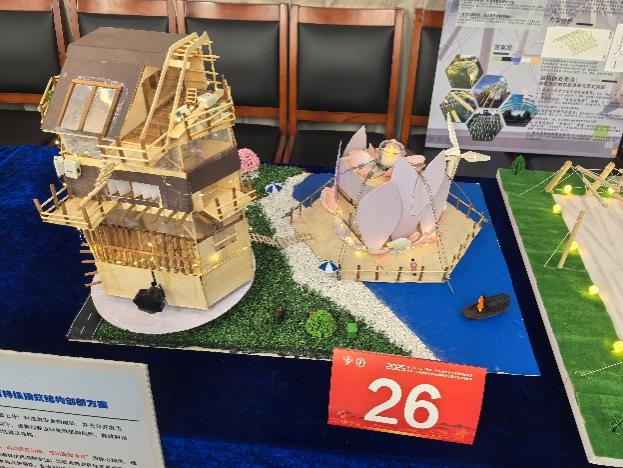 据悉,本次比赛设有模型加载和模型展示两个组别。其中,模型加载组以“乌篷船模型结构设计与制作”为主题,要求选手现场运用竹材制作满足复杂荷载要求的轻量化结构,通过模型制作、多级加载测试及答辩陈述,全面考察了参赛者的力学理解、创新思维与实践应用能力,经过激烈角逐,我校模型加载组(桂鑫宇、郜忠猛、陈启明)沉着发挥,斩获一等奖(指导教师:杨磊、周彬彬);模型展示一组(张杰、张一发、范佳炜)作品《莲翼》创新地提出钢索协同大跨度花瓣穹顶开合构造斩获一等奖(指导教师:王少伟、周彬彬),模型展示二组(张钲雨、陆淑林、沈昊翔)作品《星荷云渚》以独具特色的建筑结构荣获二等奖(指导教师:刘健鹏、杨磊)!