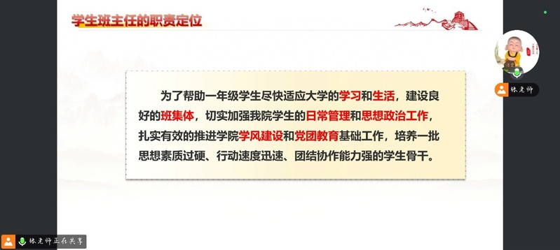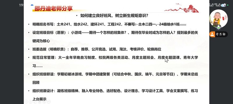 本次培训会为学生班主任明晰了工作路径,搭建了交流平台,有效促进了成人直播 新生教育引导和班级管理工作水平的提升。