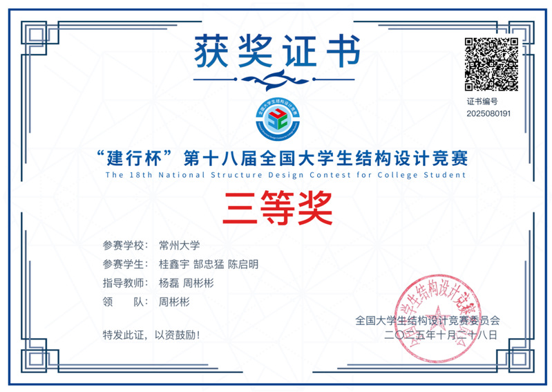 2025年10月15日至19日,由全国大学生结构设计竞赛委员会主办、绍兴文理学院承办的“建行杯”第十八届全国大学生结构设计竞赛在浙江绍兴成功举办。我校城建学院土木231班桂鑫宇、郜忠猛和陈启明组成的参赛队伍(指导教师:杨磊、周彬彬)在决赛中脱颖而出,荣获全国总决赛三等奖。
